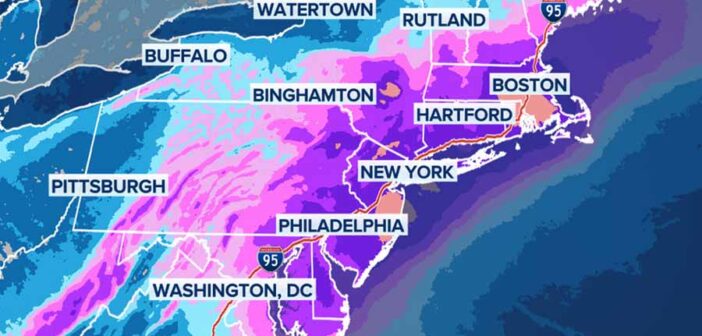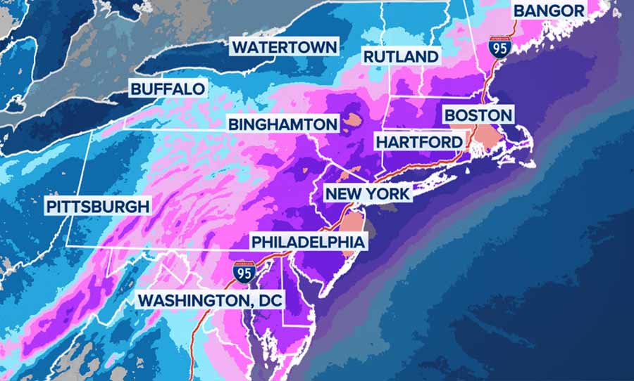Heavy snowfall, expected to reach 18 to 24 inches in areas including New York City, Philadelphia, and Boston, combined with wind gusts up to 50 mph or more, creates blizzard conditions that render runways hazardous and visibility near zero.