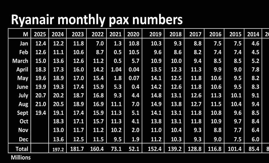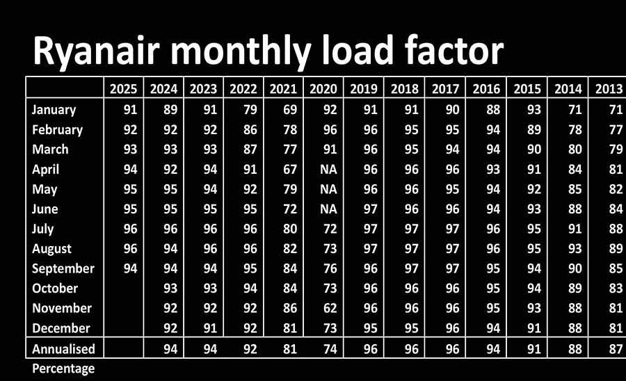 The load factor for September 2025 stayed at 94pc, unchanged from the previous year. Rolling annual passenger numbers grew by 5pc to 203.9m from 193.6m. The annual load factor remained constant at 94pc. Ryanair operated more than 107,000 flights in September 2025.