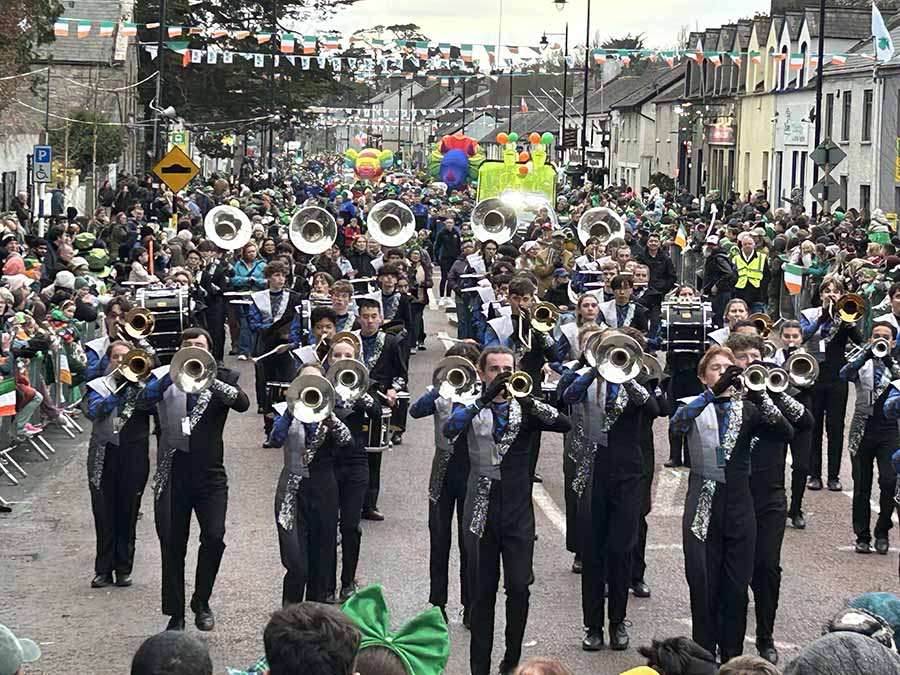 • Saint Patrick’s Day Parade (Tuesday, 17 March, 1:30 pm sharp): The flagship event starts at John Street (from John’s Priory), proceeds along Bateman Quay, High Street, The Parade, and finishes near Kilkenny Castle on Castle Road. Featuring over 2,000 performers—including marching bands, dancers, stilt-walkers, puppeteers, jugglers, local groups, and colourful floats—it is led by Grand Marshal George Candler (a renowned local livestock auctioneer, former Kilkenny Person of the Year, and long-time festival supporter). A post-parade performance by Jerry Fish takes place on the festival stage in the afternoon.