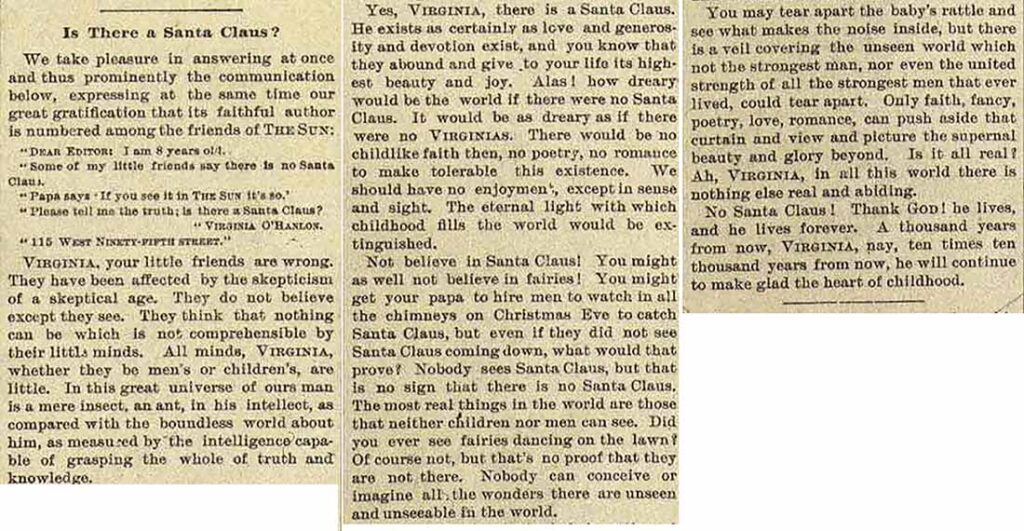 In 1897, eight-year-old Virginia O’Hanlon, a third generation Cavan girl, wrote to the New York Sun asking: “Is there a Santa Claus?” The newspaper ran an the editorial in response which endures as an oft-reprinted classic, sometimes claimed as the most famous editorial in newspaper history.: “You may tear apart the baby’s rattle and see what makes the noise inside, but there is a veil covering the unseen world which not the strongest man, nor even the united strength of all the strongest men that ever lived, could tear apart. Only faith, fancy, poetry, love, romance, can push aside that curtain and view and picture the supernal beauty and glory beyond. Is it all real? Ah, Virginia, in all this world there is nothing else real and abiding. No Santa Claus? Thank God, he lives, and he lives forever. A thousand years from now, Virginia, nay, ten times ten thousand years from now, he will continue to make glad the heart of childhood.“