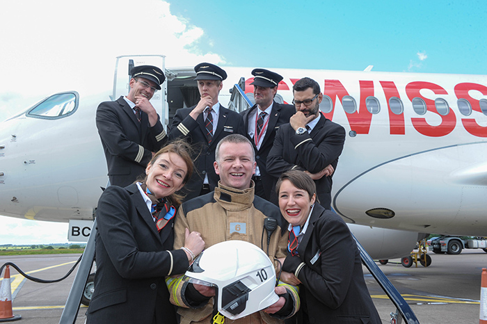 John McCarthy, Station Officer, Airport Fire Service gets a big hug from crew members Corine Schappler and Jessica Wege as captain and first officers look on in the background. Andreas Triska;  R Sutter (Capt); F Noel and Mateusz Krakowiak. Pic: Brian Lougheed Photography