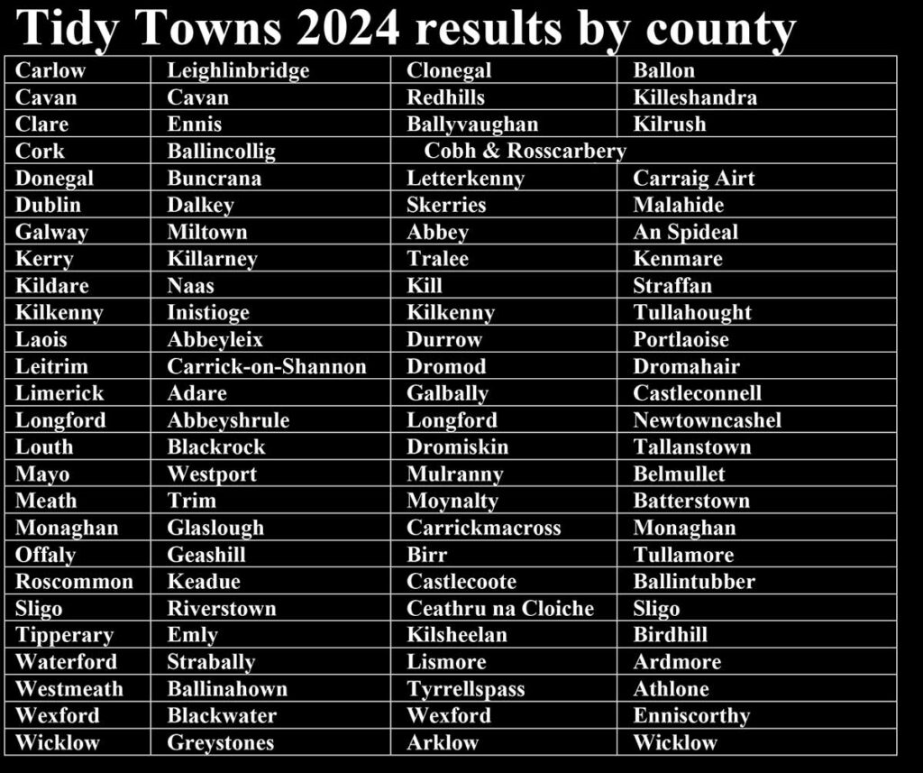 The event celebrated various winners, including Ballinahown (Tidiest Village), Blackrock (Tidiest Small Town), and Westport (Tidiest Large Town.