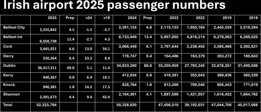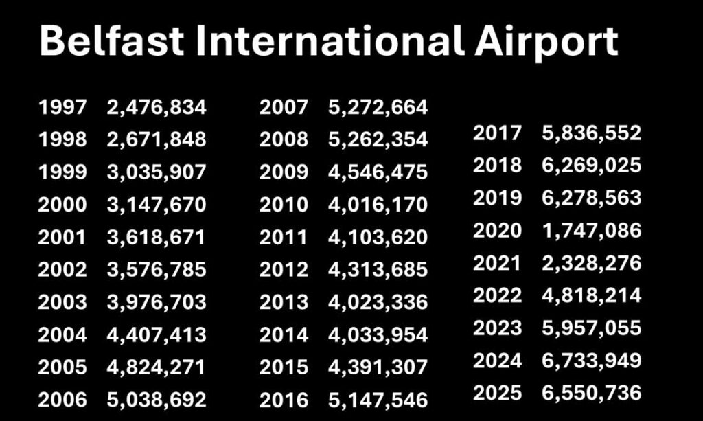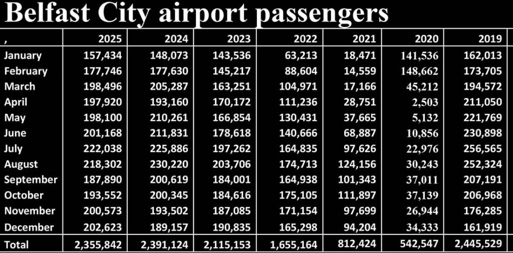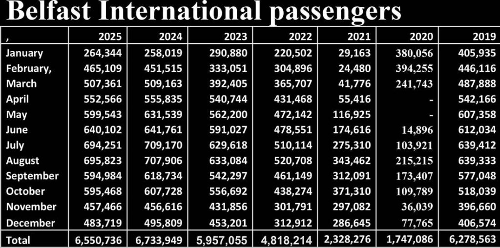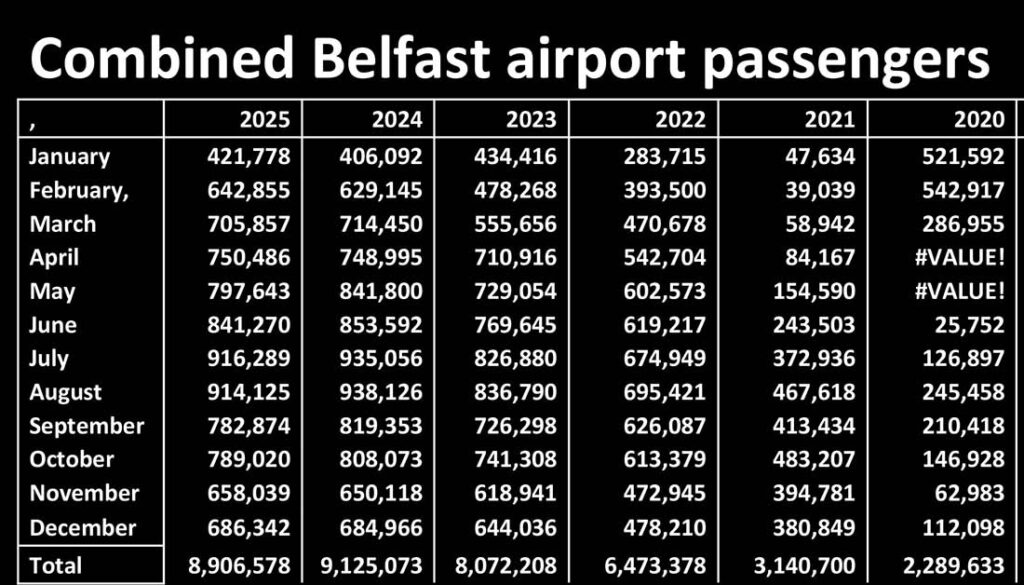 Combined Belfast airport figure scope 2025 were 8,906,578, down 0.8pc on 2024 and 3.2pc on pre-pandemic. The airports handled 16.9pc of the air passenger traffic on and off the island.
