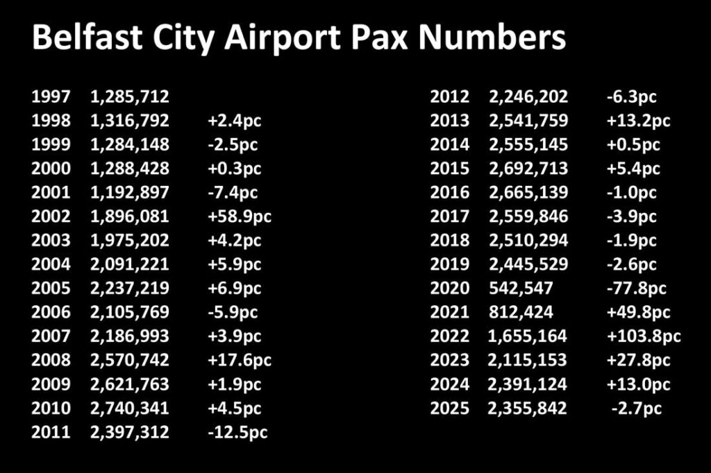 Belfast International airport numbers were down 2.7pc to 6,550,736 and Belfast city airport numbers down 1.5pc to 2,355,842. Belfast International airport is 4.3pc ahead of pre-pandemic.