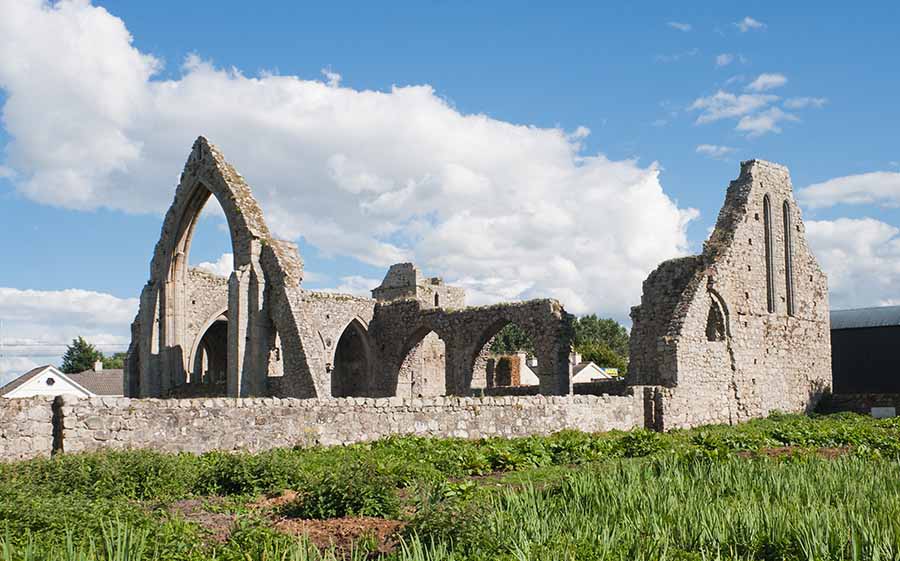 Cross to enter the atmospheric ruins of the Franciscan friary, founded around 1247 or earlier under Norman patronage, its church boasting a 13th-century nave and chancel extended in the 14th century with an aisle; though sacked by Robert Bruce and later Cromwellian forces, the impressive Gothic remnants endure, including a small tower, the Chapel of St Mary with its macabre early 16th-century cadaver tomb of Joanna Skelton and James Tallon featuring graphic skeletal carvings, an ancient baptismal font, and the soaring east window once famed for its stained glass, fragments of which were found into the 1860s.