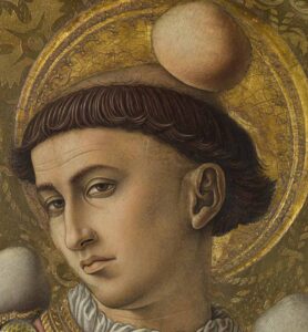 Saint Stephen by Carlo Crivelli 1476, identifiable by the stone on his head, can be seen in the National Gallery, London