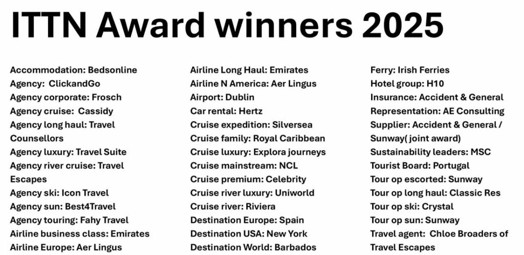 Clickandgo won the travel agency award and Chloe Broaders of Travel Escapes the travel agent award at the ITTN awards in the Clayton Burlington Hotel in Dublin.