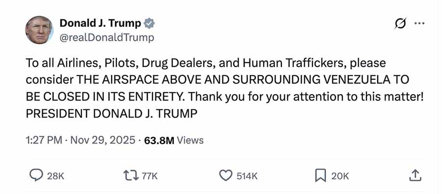 Donald Trump shared “To all Airlines, Pilots, Drug Dealers, and Human Traffickers, please consider THE AIRSPACE ABOVE AND SURROUNDING VENEZUELA TO BE CLOSED IN ITS ENTIRETY.”