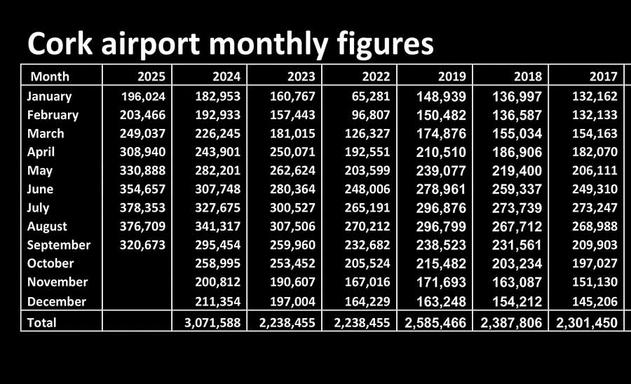 Cork airport handled 320,673 passengers in September, up 8.5pc on 2024 and 34.4pc on pre pandemic. Rolling annual was 3,389,908, up 11.5pc on last year.