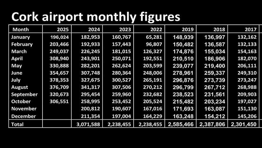Cork airport handled 306,551 passengers in October, up 18.4pc on October 2024 and 42.3pc on pre-pandemic. Rolling annual was 3,437,464, up by 12.8pc.