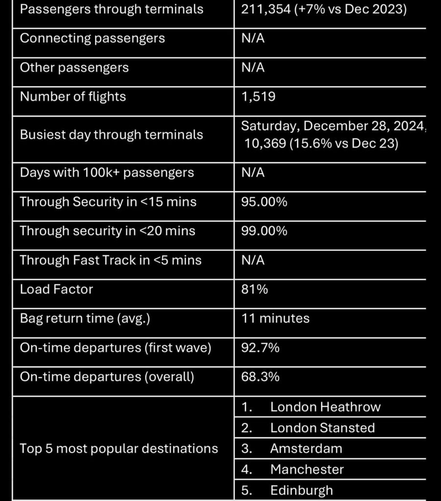 A written statement shared: Cork Airport had a record-breaking December, welcoming 211k passengers, a 7% increase on December 2023. The busiest day was Saturday, December 28, when 10k passengers passed through the airport, up 15.6% versus the same day in 2023. Another significant milestone was achieved on Friday, December 20, when Cork welcomed its three millionth passenger, the first time Cork surpassed this yearly milestone since 2008. 2024 was also the busiest year for international passenger traffic in the airport’s 63-year history, and Cork Airport was Ireland’s fastest-growing airport in 2024.