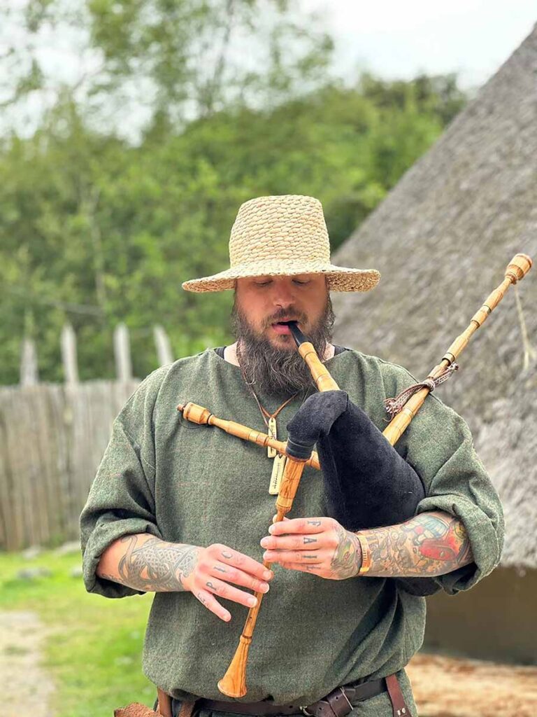 Resident Craggaunowen musician Arno Kilhoffer performing music with medieval bagpipes.