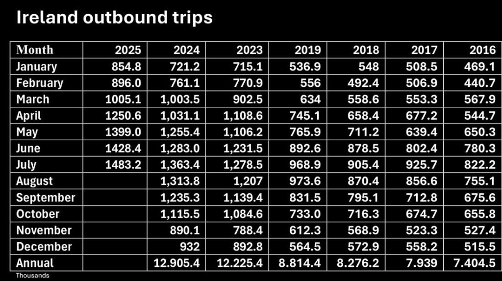 CSO figures show outbound travel from ireland in July reached a record 1.48m, was up 8.8pc on 2024 and up 53.1pc on pre pandemic.