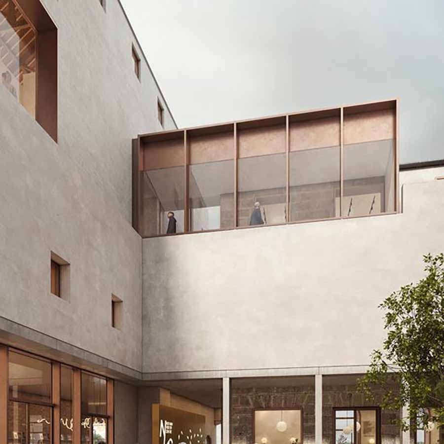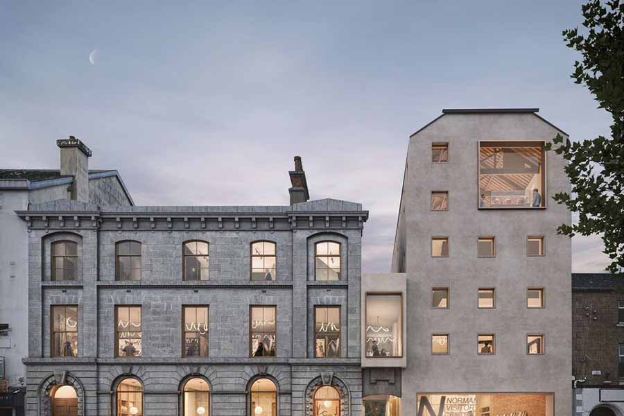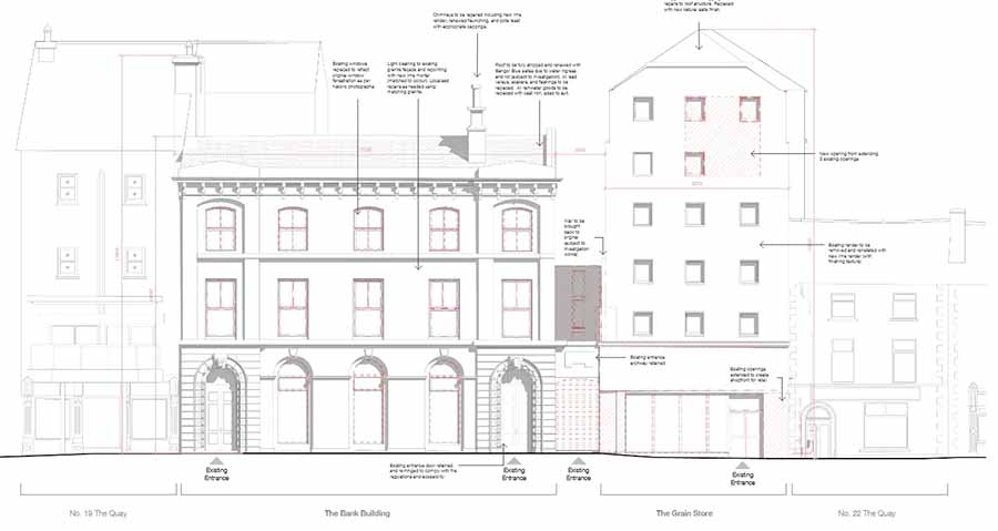 The project transforms the former Bank of Ireland building and adjacent Grain Store into a multi-purpose tourist attraction with café, retail, and interactive exhibition spaces. A building to the rear of the Grain Store will be demolished, replaced by a new pavilion for teaching and events, featuring an enclosed courtyard.