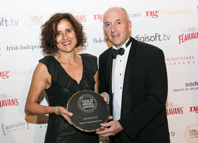 Isabelle Kelly and Bill Kelly of Kelly’s Resort Hotel, winner of Ireland’s Family Friendly Hotel at Gold Medal Awards at Lyrath Estate Hotel