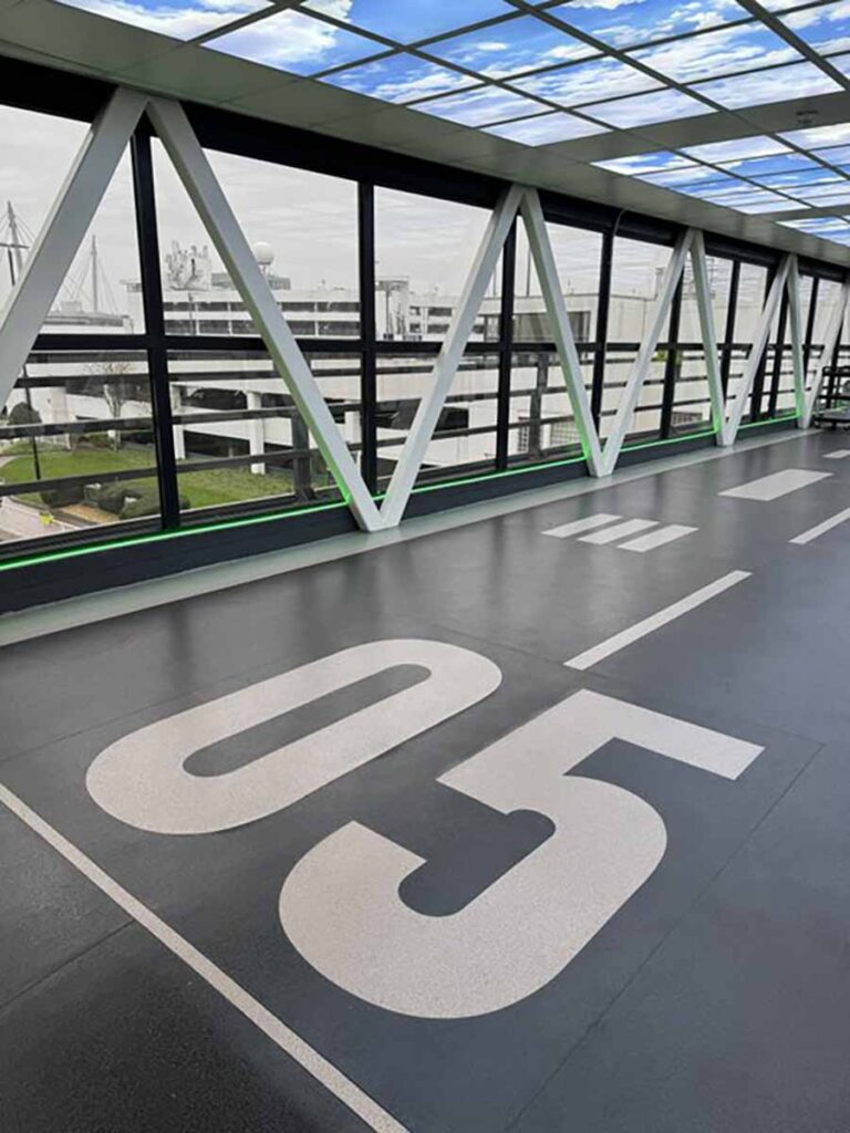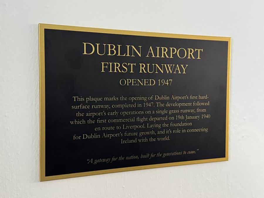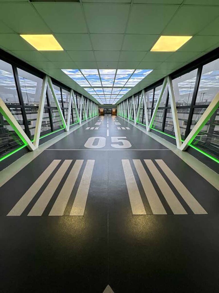 Dublin airport shared: Our revamp of the walkway between the T1 short-term car park and the terminal pays homage to the first ever concrete runway at Dublin Airport (23/05), which opened in 1947.
