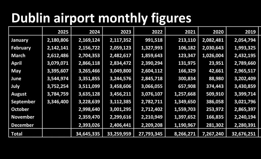 Dublin airport handled 3,346,400 passengers in September, up 3.6pc on 2024 and 10.7pc on pre-pandemic. Rolling annual was 35,589,634, up 2.9pc on last year.
