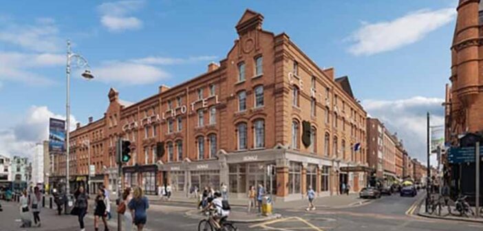 The hotel sits in Dublin’s Creative Quarter, near George’s Street Arcade, Powerscourt Townhouse Centre and Temple Bar. The lobby functions as an open-house space with a bar, lounge and displays of Viking-era archaeological finds from the site. Cantina Valentina operates as an all-day Peruvian-inspired restaurant with breakfast bowls, sandwiches and pisco cocktails. Dollars serves as a New York-inspired sandwich spot by day that converts to a natural wine bar by night. The Library Bar, a fixture from the Central Hotel era, features oak-lined barbacks, marble countertops and stained-glass windows; it offers cheese toasties and Guinness. Groundwork, a basement venue with capacity for 220 people, remains closed until early 2026 for nightlife events.