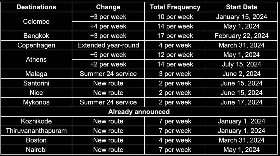 Additional frequency and capacity enhancements have been made to destinations including Athens, Copenhagen, Malaga, Bangkok, and Colombo.