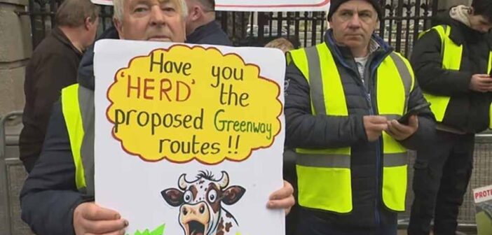 Groups travelled from Galway, Cork, Waterford, and Cooley Peninsula in Co Louth. The protest coincided with Joint Committee on Transport discussion on greenways. They said they were voicing concerns focus on greenways as leisure projects are forcing land takeover. The farmers argue that CPOs threaten to break up small farms and pass through homes and gardens.