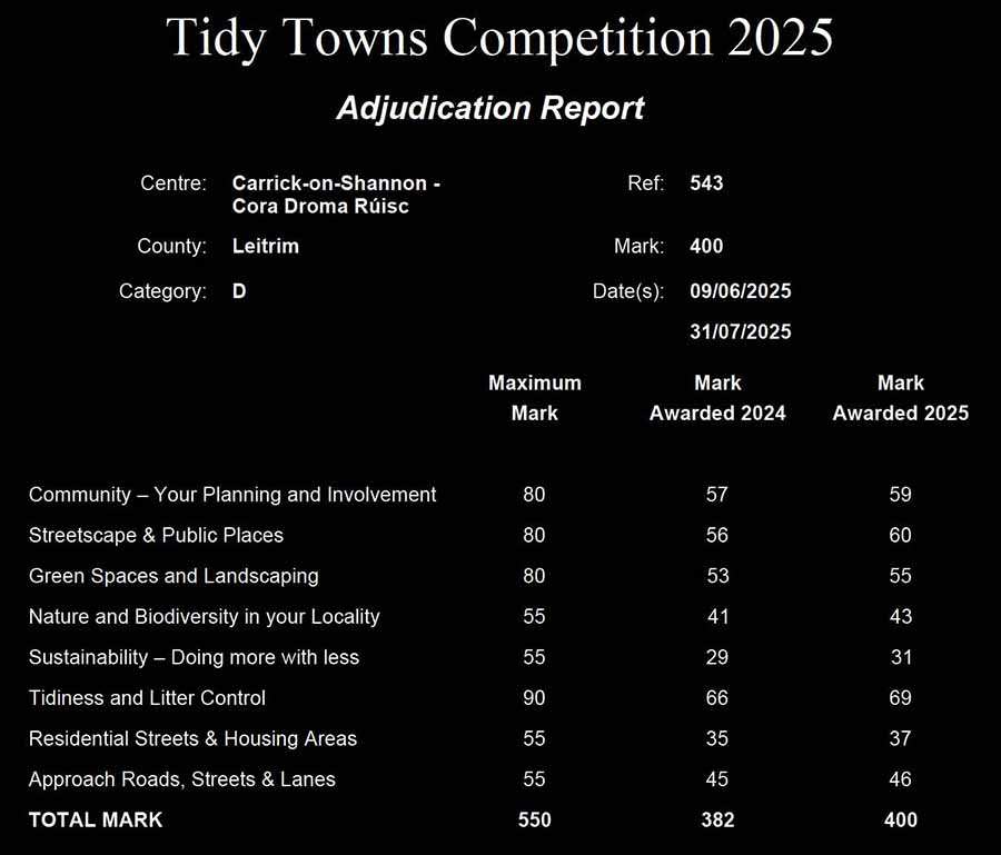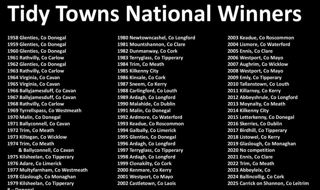 Carrick-on-Shannon in Co Leitrim secured the overall winner title in SuperValu Tidy Towns 2025 and also claimed the small town category.