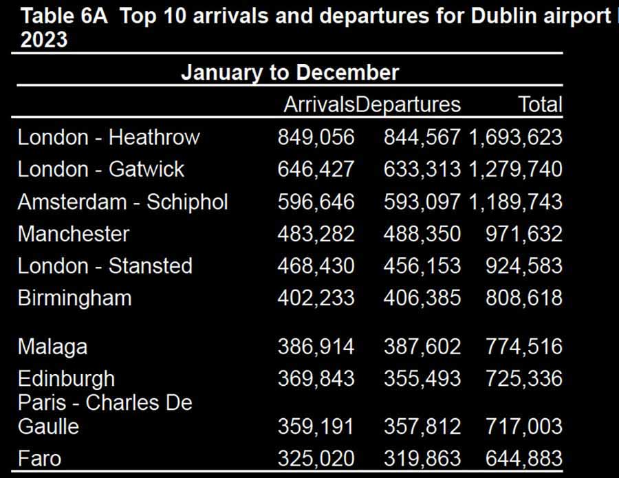 New figures from the Central Statistics Office show Heathrow, Gatwick and Amsterdam are the busiest routes to and from Dublin airport.