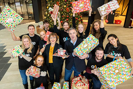 Microsoft employees in Dublin joined (centre left) Cathriona Hallahan, Managing Director, Microsoft Ireland, and (centre right) Brian Ingarfield, Dublin Simon Community as company employees donated €30,000 and hundreds of gifts to the organisation. Photo: Naoise Culhane