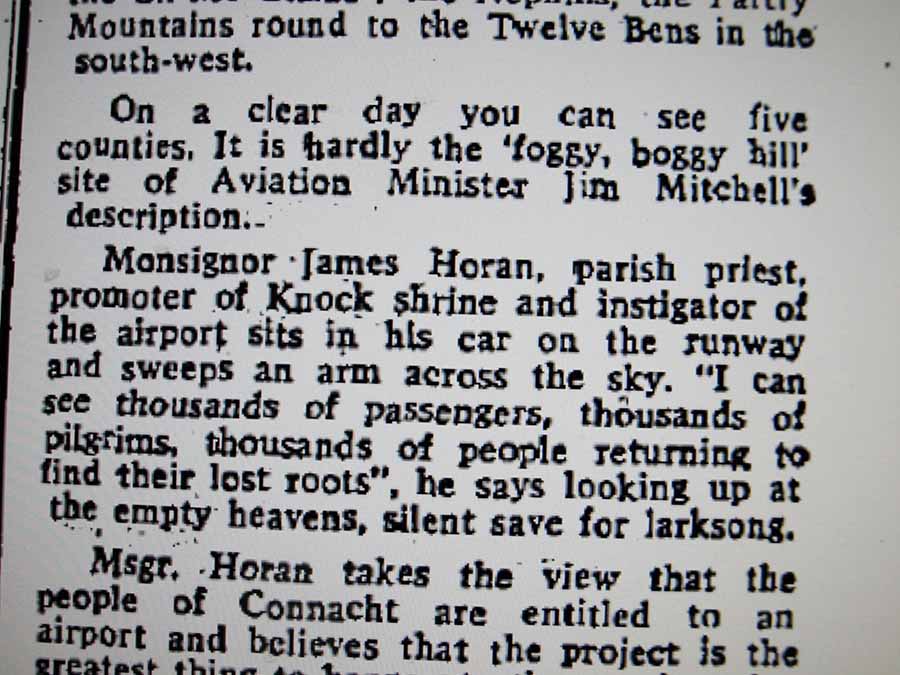 Despite the Monsignor’s campaign, no inbound pilgrimage flights services were launched at the airport, which largely remains an outbound facility for sun holidays and routes to England from the Mayo region.