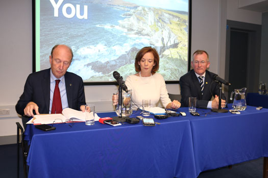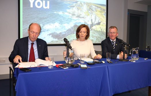 Tourism Minister Shane Ross with Tourism Ireland Chairman Joan O'Shaughnessy and CEO Niall Gibbons at the Tourism Ireland mid-year media briefing, Chester Beatty Library, Dublin Castle, August 14, 2018