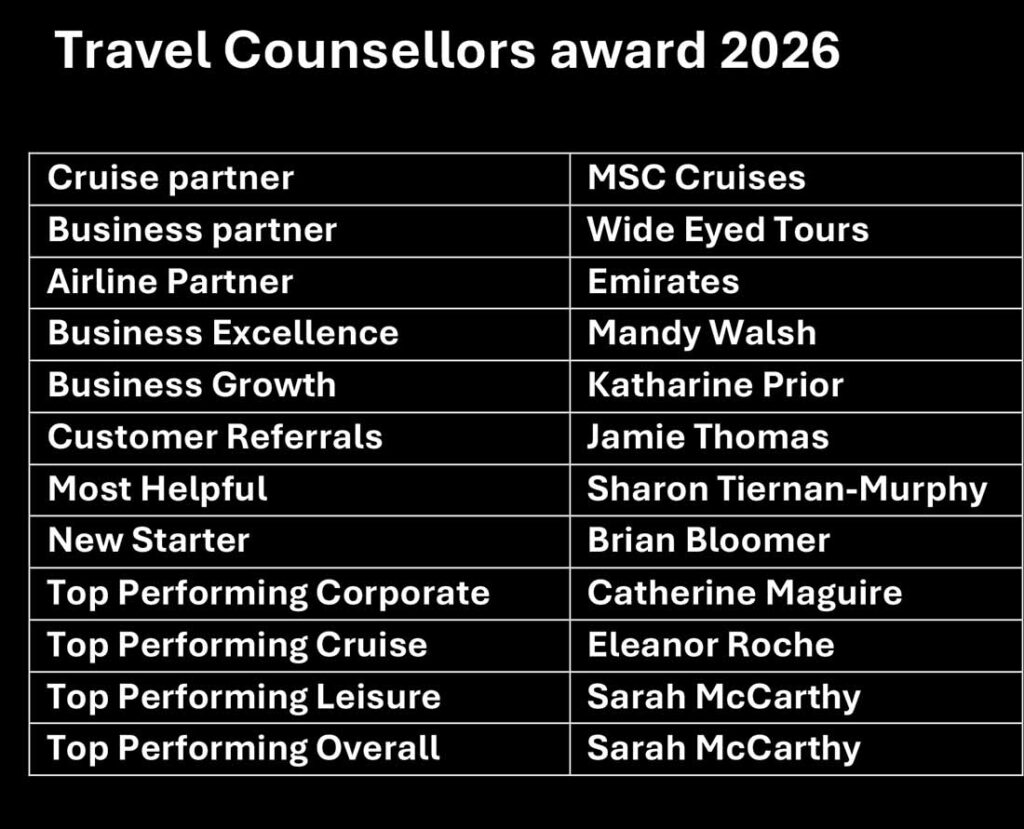 Sarah McCarthy won the top performing Travel Counsellor overall and top performing leisure at the annual awards ceremony hosted by the home workers group at Fota Island resort in Cork.