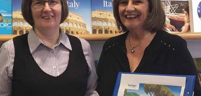 Photograph shows Hilary Alexander of Greers Travel, Ballymena, Co Antrim winner of the Topflight Valentine’s Giveaway receiving her presentation from Jill Russell of Topflight after winning the Topflight Valentine’s Giveaway agent promotion.