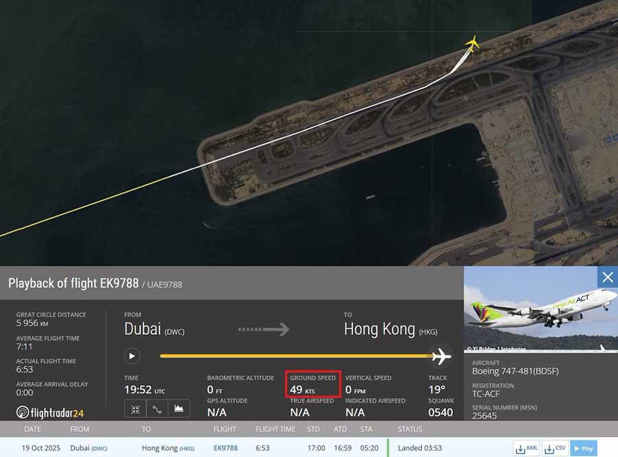 Aircraft registration TC-ACF, a Boeing 747-481F leased from ACT Airlines, operated Emirates SkyCargo flight EK9788 from Dubai to Hong Kong International Airport.
