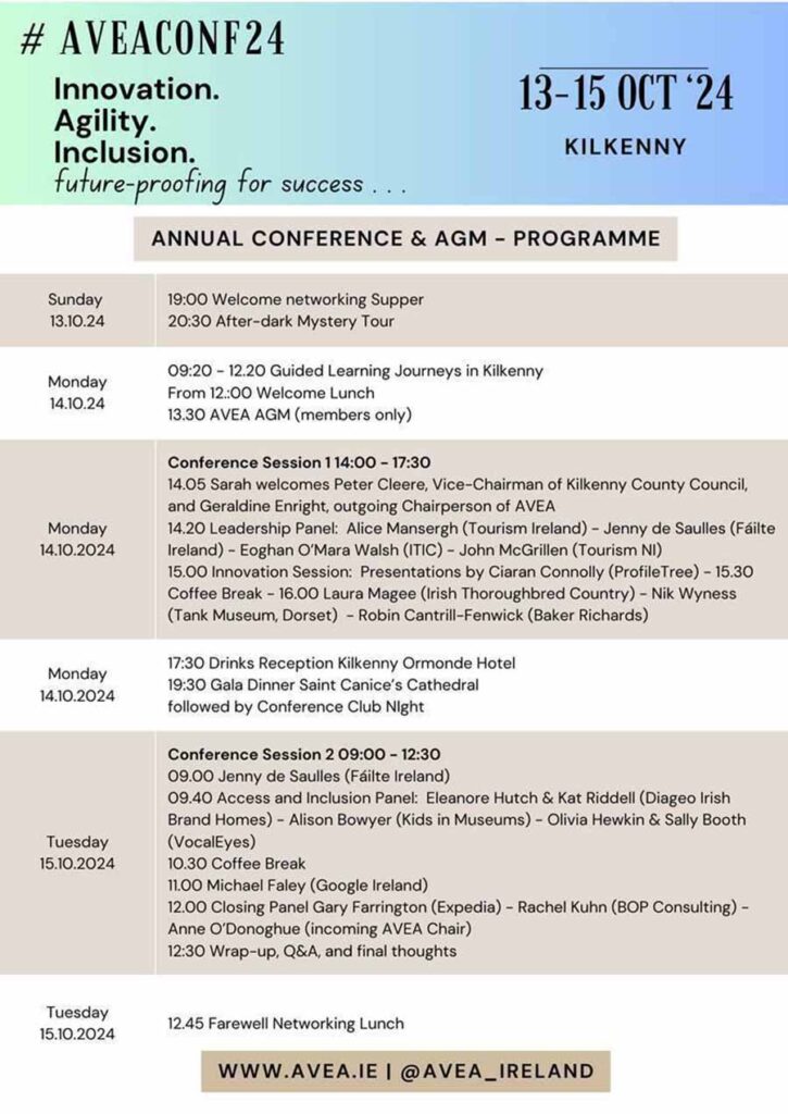 Delegates will gather in Kilkenny this evening for the annual conference and AGM of the association for the Visitor Experience and Attractions industry in Ireland (AVEA). Over October 13-15, 2024, it will feature networking, guided learning journeys, and discussions focused on innovation, agility, and inclusion.