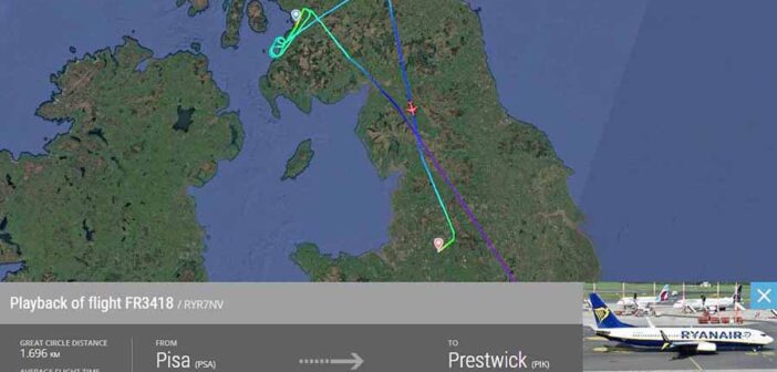 The Boeing 737-800, registered 9H-QBD and operated by Malta Air, departed Pisa Galileo Galilei Airport at 17:28 local time, bound for Glasgow Prestwick Airport with 189 passengers and four crew members.