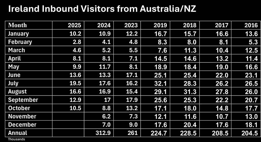 - Visitors from Australia and New Zealand were up 9.3pc on last year and down 38.8pc on pre-pandemic, rolling annual was 121.900, down 6.2pc on the 12 months to October 2024.