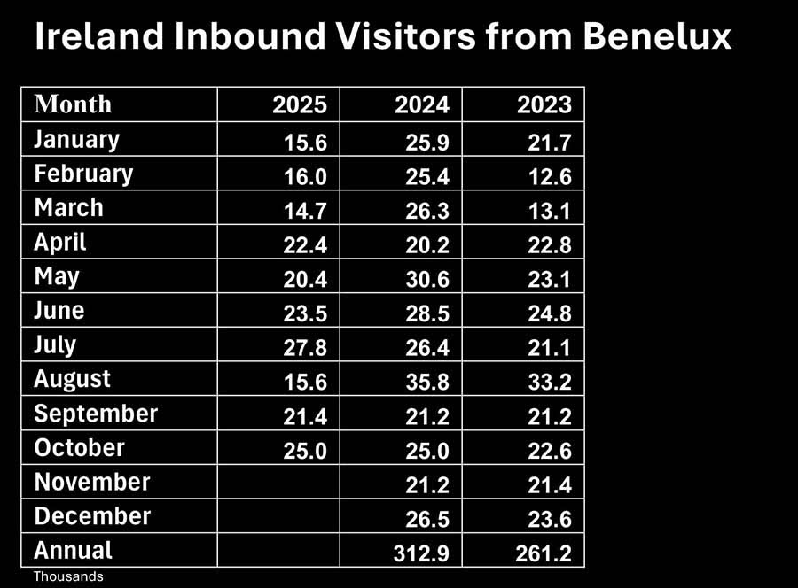 - Visitors from Benelux were flat on last year rolling annual was 263.400, down 15.1pc on the 12 months to October 2024.