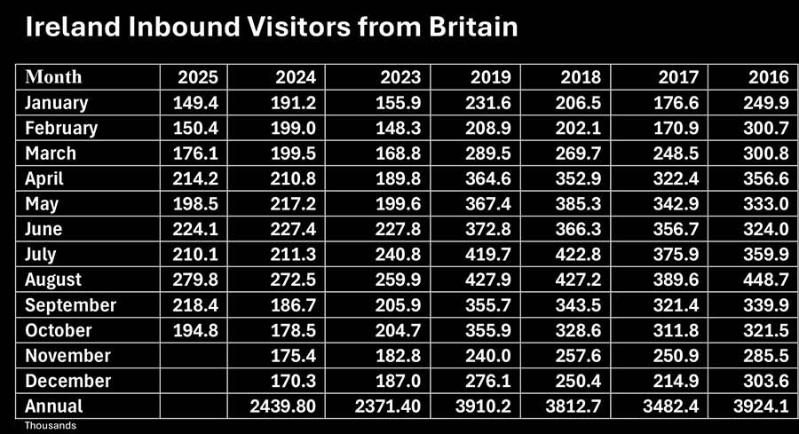 - Visitors from Britain are up 9.1pc on last year and down 45.3pc on pre-pandemic, rolling annual was 2,361,500, up 9.1pc on the 12 months to October 2024.