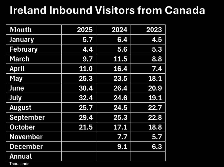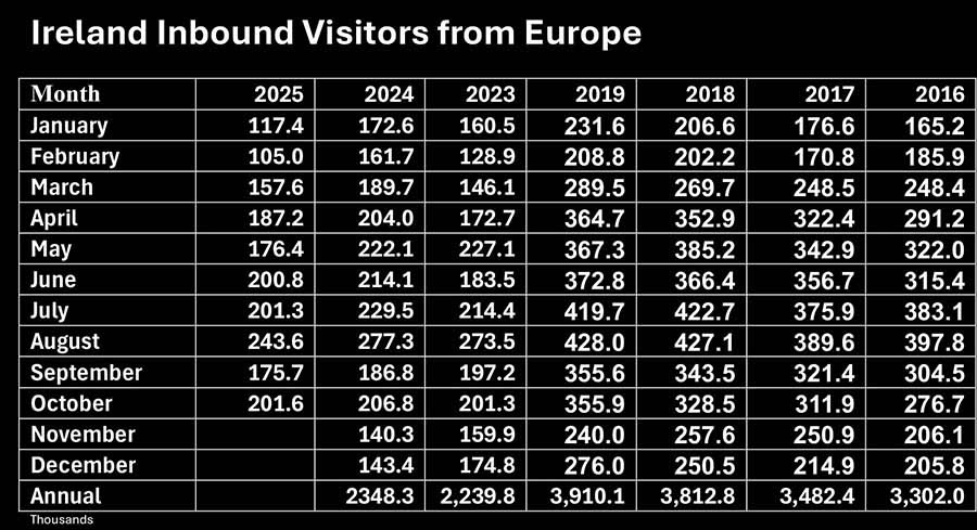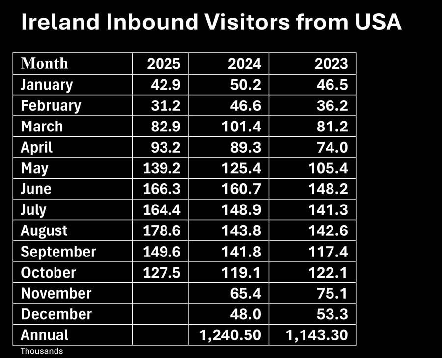 August inbound visitor numbers were up by 1.2pc, the only previous year on year increased recorded in 2025 by the CSO. Numbers were down by -25.0 pc in January, -29.8pc in February, -15.4 pc in March, -3.8 pc in April, -9.9 pc in May, -2.2 pc in June and -1.4 pc in July.