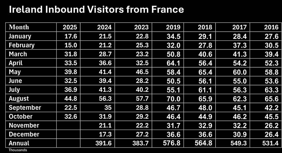 - Visitors from France were up 2.2pc after a colossal drop of 35.7pc in October, and down 29.7pc on pre-pandemic, rolling annual was 345.400, down 51.3pc on the 12 months to October 2024.