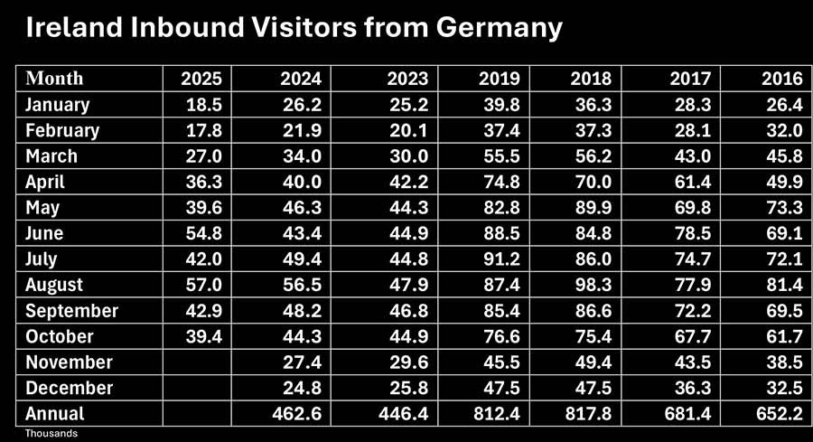 - Visitors from Germany were down 11.1pc on on last year and down 48.6pc on pre-pandemic, rolling annual was 427,500, down 8.2pc on the 12 months to October 2024.