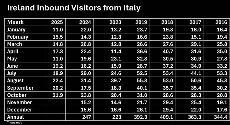 - Visitors from Italy were down 8pc on last year and down 29.4pc on pre-pandemic, rolling annual was 203,000, down 18.2pc on the 12 months to October 2024.
