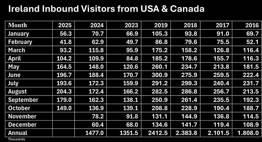 - Visitors from USA were up 7.1pc on last year and down 29.8pc on pre=pandemic, rolling annual was 1,289,200, up 2.7pc on the 12 months to Octoberr 2024.