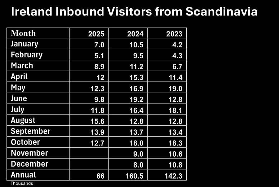 - Visitors from Scandinavia were down 29.4pc on last year,, rolling annual was