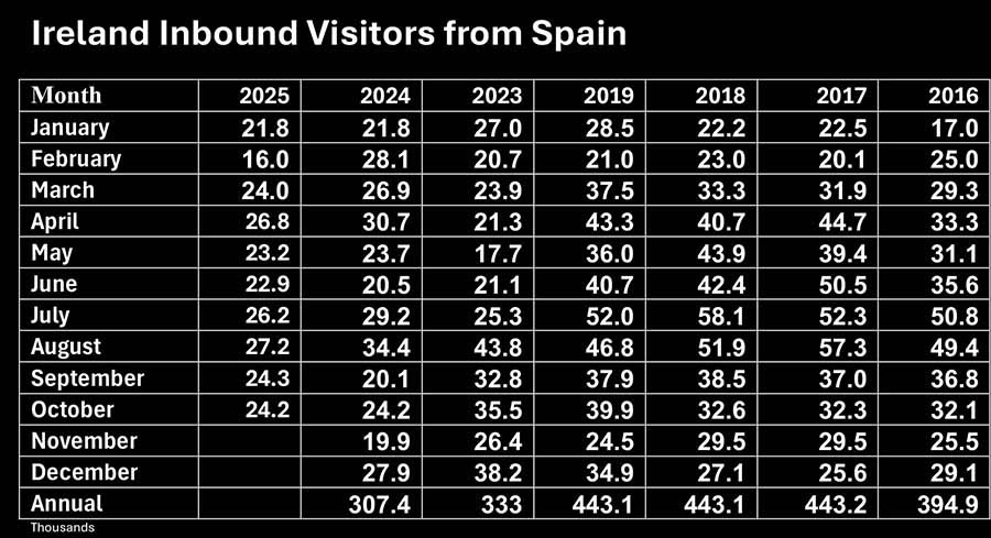 126.100, down 23.5pc on the 12 months to October 2024. - Visitors from Spain and Portugal were flat compared with last year and down 39.3pc on pre-pandemic, rolling annual was 550,100, down 12.5pc on the 12 months to October 2024.