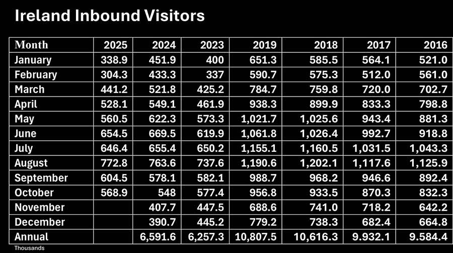 Some 568,900 foreign residents completed vsits to Ireland in October 2025 according to the Central Statistics Office, up 3.8pc compared with October 2024 and down 40.5pc on pre-pandemic. These visitors spent 4.0m nights in Ireland, up 4pc with the same month in 2024. Rolling annual was 6,218,500, down 7pc on last year.