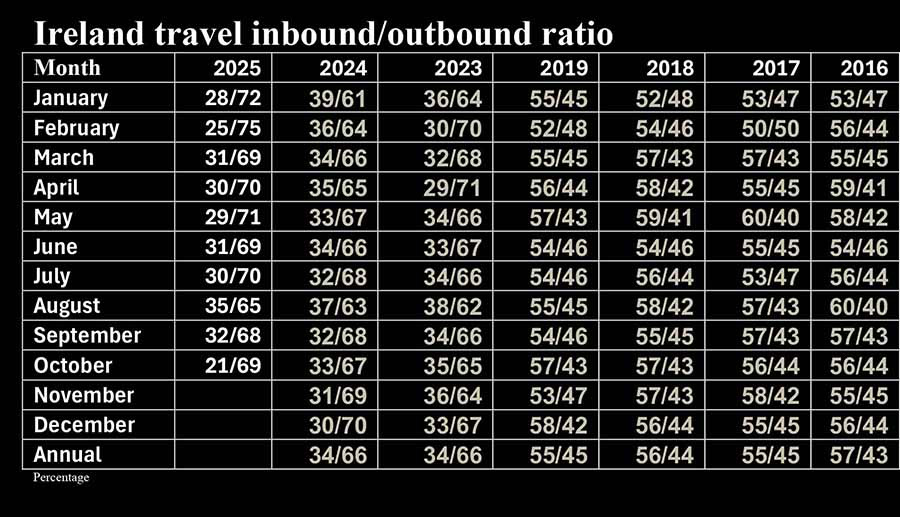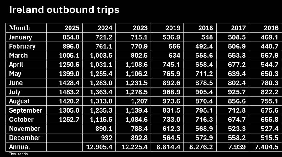 Outbound trips for October reached 1,252,700 up 12.3pc on 2024 and 70.9pc on pre pandemic with rolling annual up slightly by 10.6pc to 12,764,500. The outbound to inbound proportion has changed dramatically since the CSO changed its methodology after the pandemic. In September the ratio was 31pc inbound and 69pc outbound, compared with majority inbound figures of 57/43 in October 2019 and 2018.