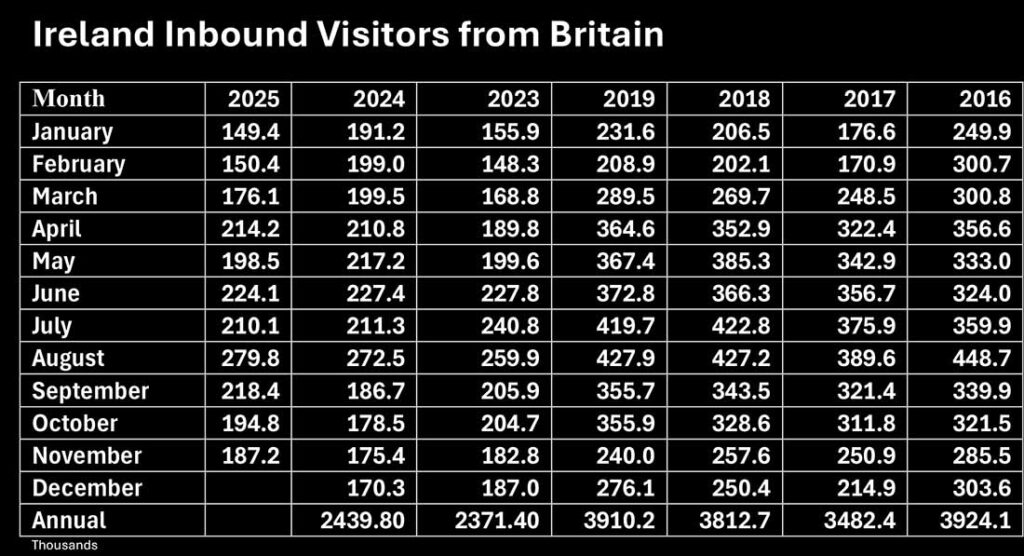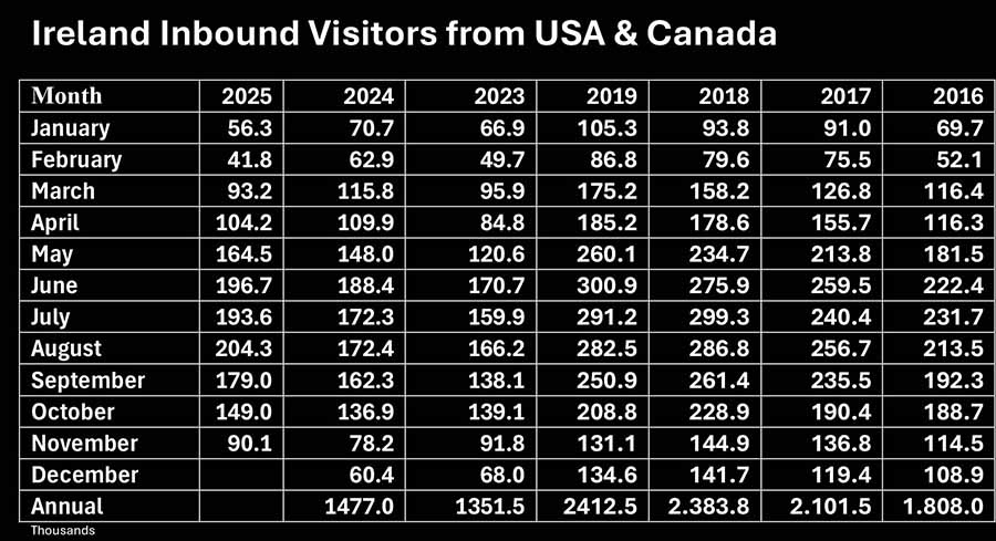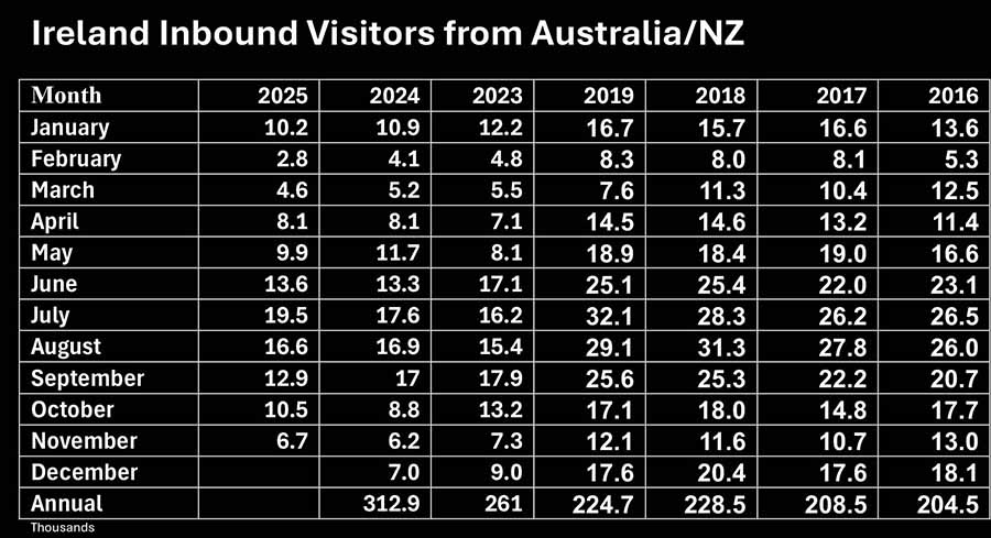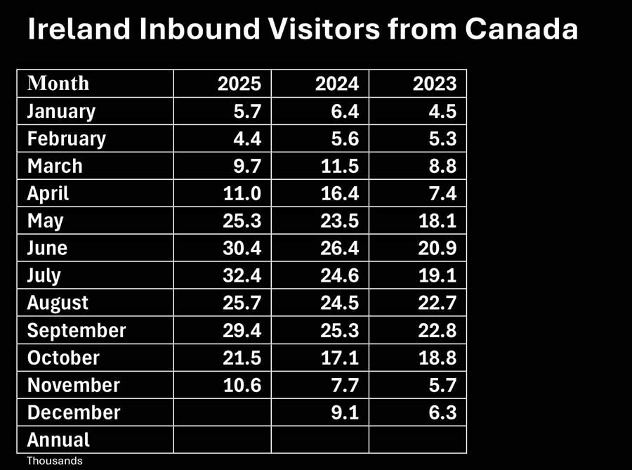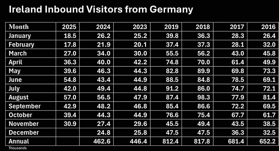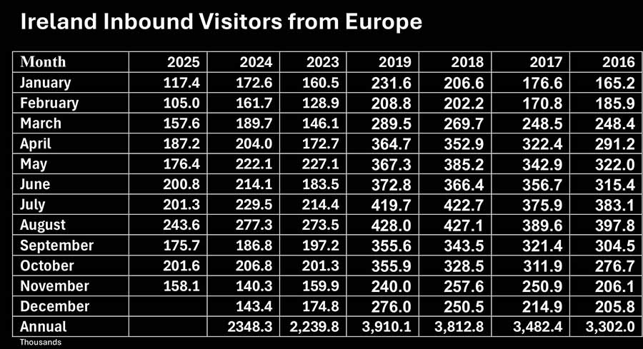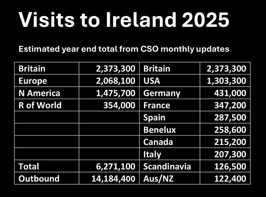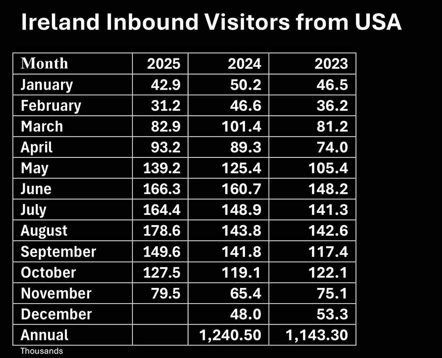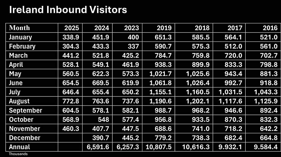 Visitor numbers to Ireland form all markets are down 4.6pc in the twelve months to November according to the latest figures from the Central Statistics Office. Rolling annual was 6,271,100 compared with 6,645,900 in the twelve months to November 2024.