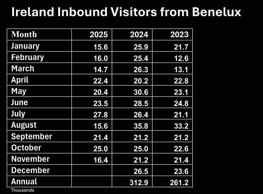 • • Visitors from Benelux were down 22.5pc on last year  rolling annual was 258.600, down 16.6pc on the 12 months to November 2024.
