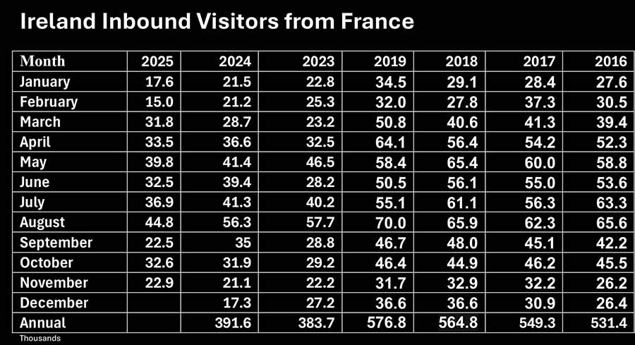 • Visitors from France were up 8.5pc on last year and down 27.8pc on pre-pandemic, rolling annual was 347.200, down 13.5pc on the 12 months to November 2024.
