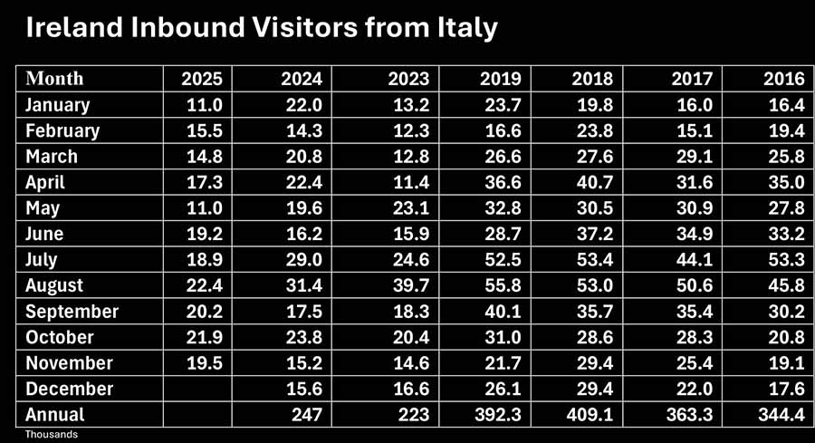• Visitors from Italy were up 28.3pc on last year and down 10.1pc on pre-pandemic, rolling annual was 207,300, down 16.7pc on the 12 months to October 2024.